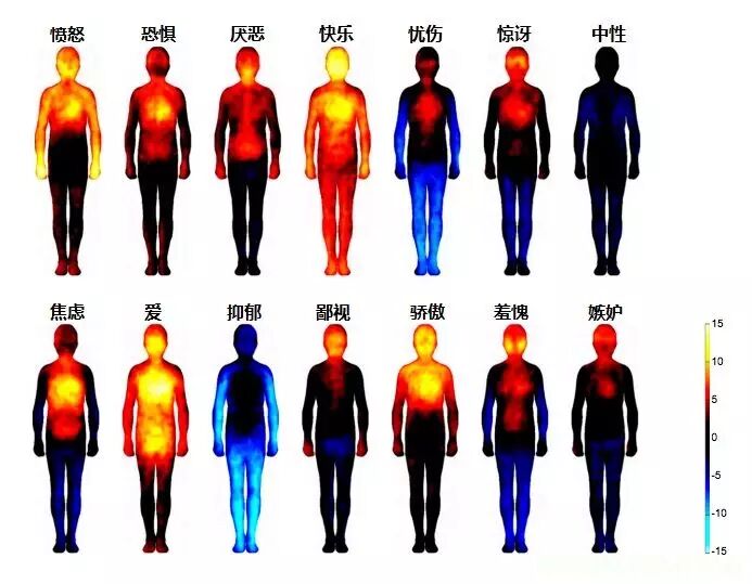 下图正是一幅人体情绪热度分布图,描绘了不同情绪在人体哪个部位呈现出最强烈的表征。充分认识到情绪所引发的身体变化,甚至还能开辟潜能。